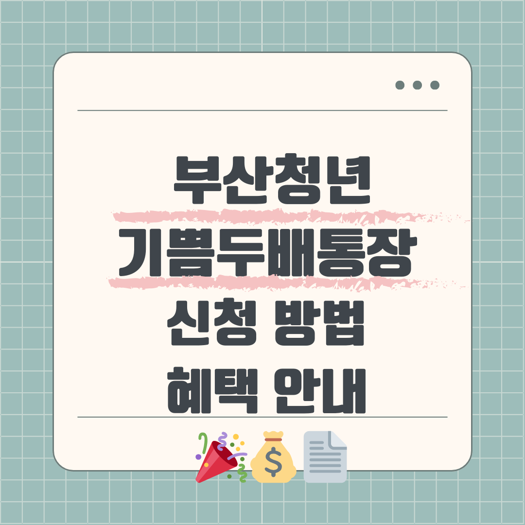 부산청년기쁨두배통장은 부산 청년들에게 경제적 자립을 돕기 위한 특별한 저축 상품입니다. 이 통장을 신청하면 본인이 저축한 금액에 대해 부산시가 동일한 금액을 매칭하여 저축해줍니다. 이제 여러분도 부산청년기쁨두배통장을 신청하고 더 나은 재정적 미래를 계획해보세요!